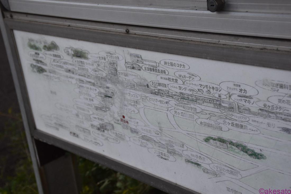丁字路、バス停の近くの掲示板に商店街の案内図が載っていた。これは有難い!横長なので撮影するのが難しかったが…