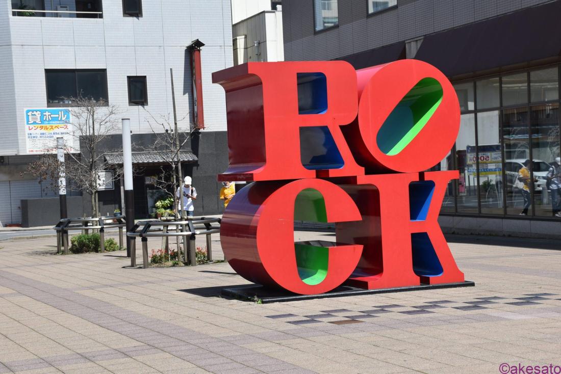勝田駅東口のロータリー前、ROCKの赤いモニュメントが設置されていた。