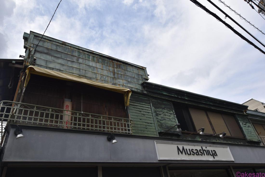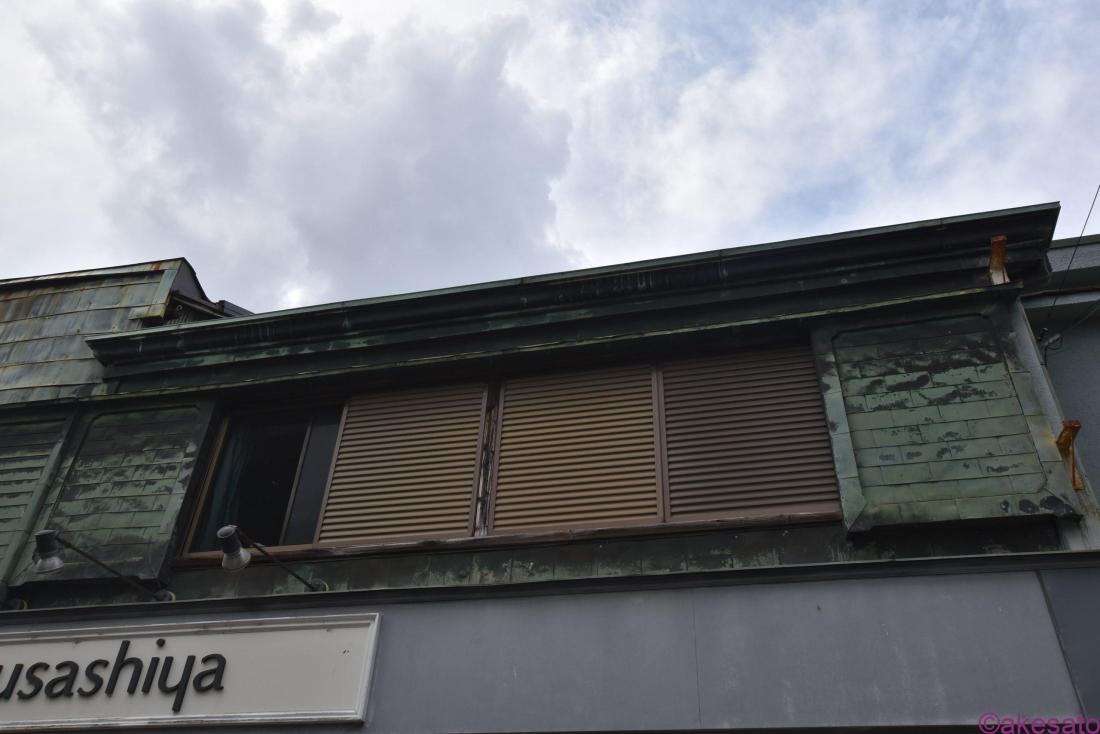 その先にあるのは、緑色が美しい銅板の看板建築!大門通りにこんなにしっかりとした看板建築があると思っていなかったので驚き。