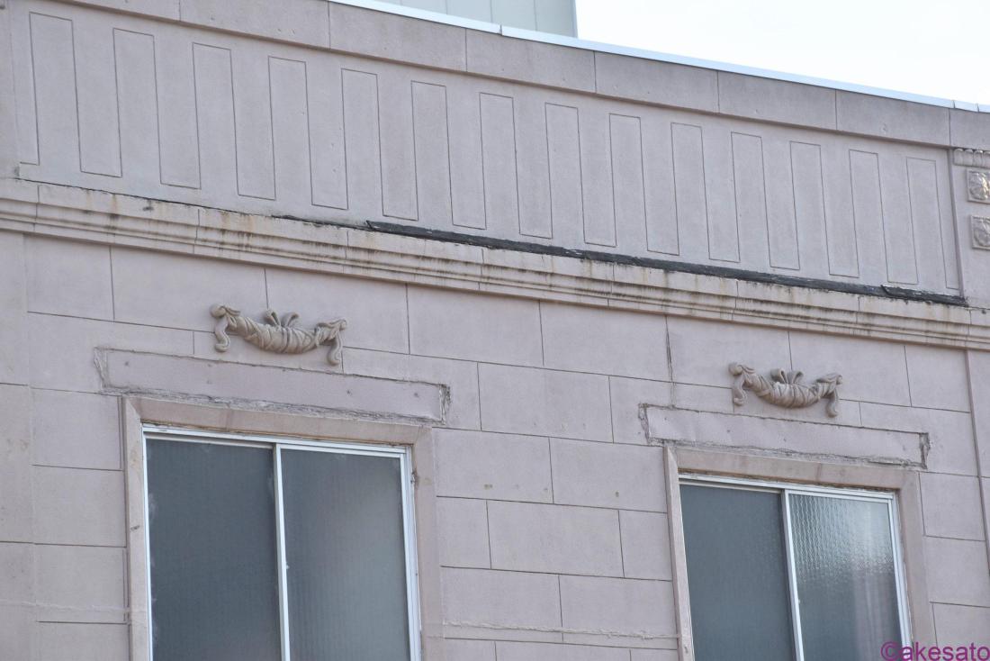 拡大してみてみると、二階の窓上にリボンを巻いたかのような意匠が付いている。