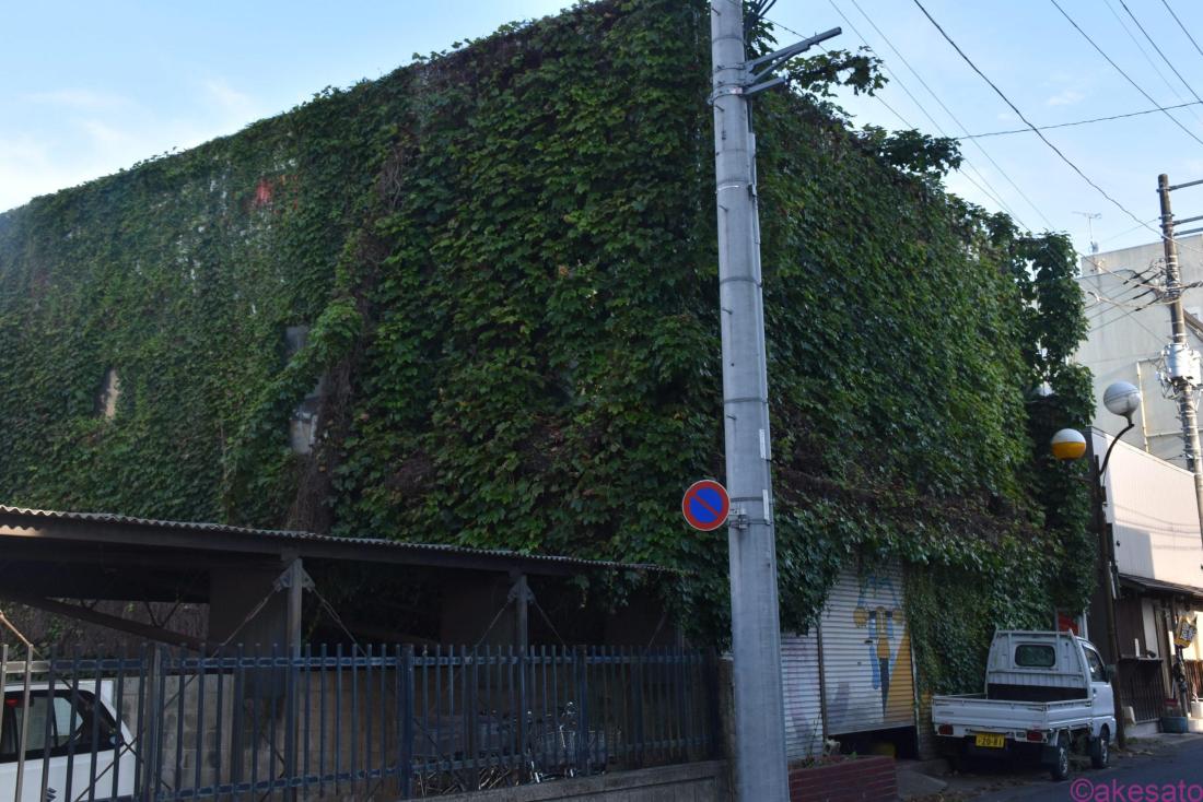 そしてしばらく進んだ裏道、元自転車屋さんの建物が蔦に覆われてしまっている。
