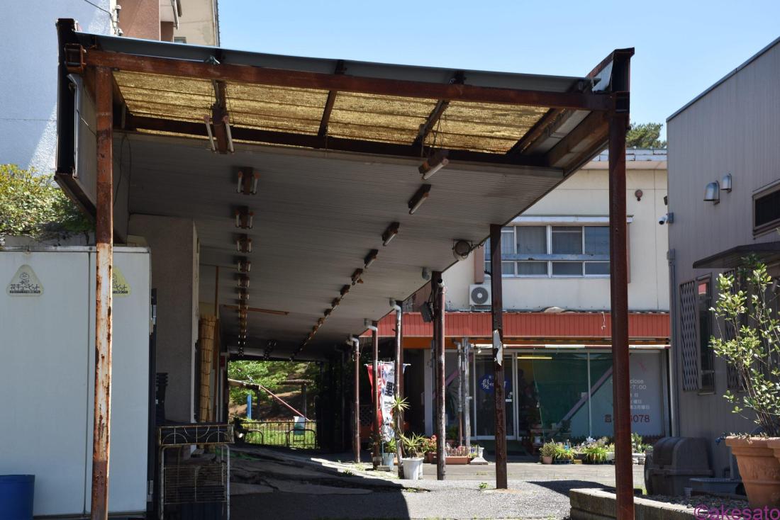 入り口の左手前には駐車場があり、昔の看板が残っていた。