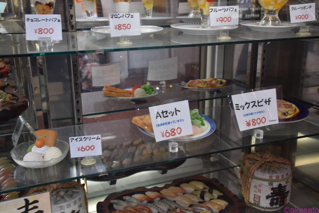 カネコビルの3階。外に設置してあるショーケースに喫茶店のメニューが並ぶ。