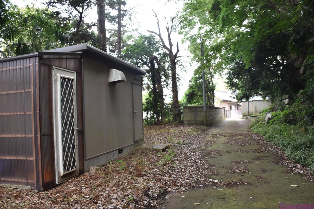 木造の建物の隣、トタン板で覆われた建物は何だろう?