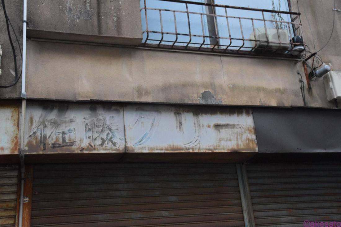 シャッターが閉まっている。手前は佐藤クリーニングの文字が少しだけ見えるな~