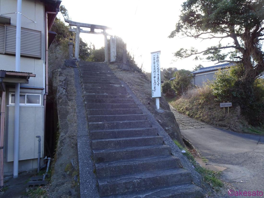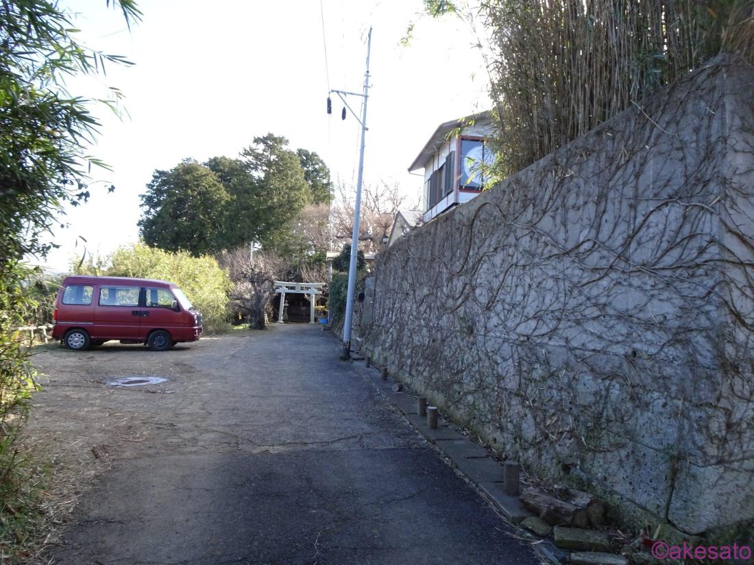 石切り場の手前、高台にある天神社へ。入口の鳥居を横目に、右手の道を進んでいく。鳥居の階段を上っても右の道を進んでも同じ道に合流する。
