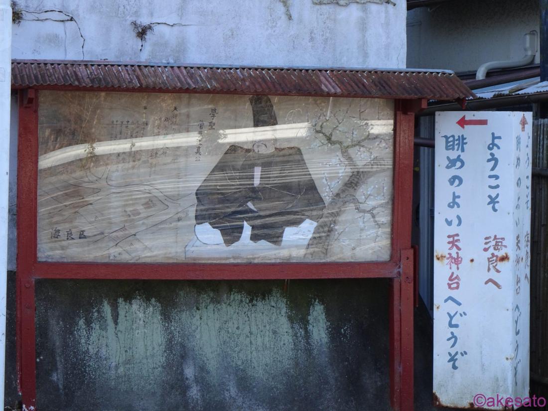 気になる看板が立っていた。「ようこそ海良へ 眺めのよい天神台へどうぞ」と、菅原道真が描かれた周辺の案内図。手書きなのがポイント高い。