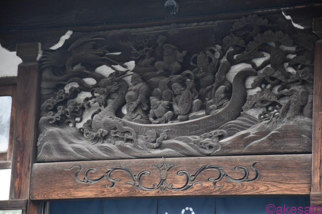 七福神の彫刻かな?和やかな表情の彫刻を見ているとなんだか幸せになりそうだ。
