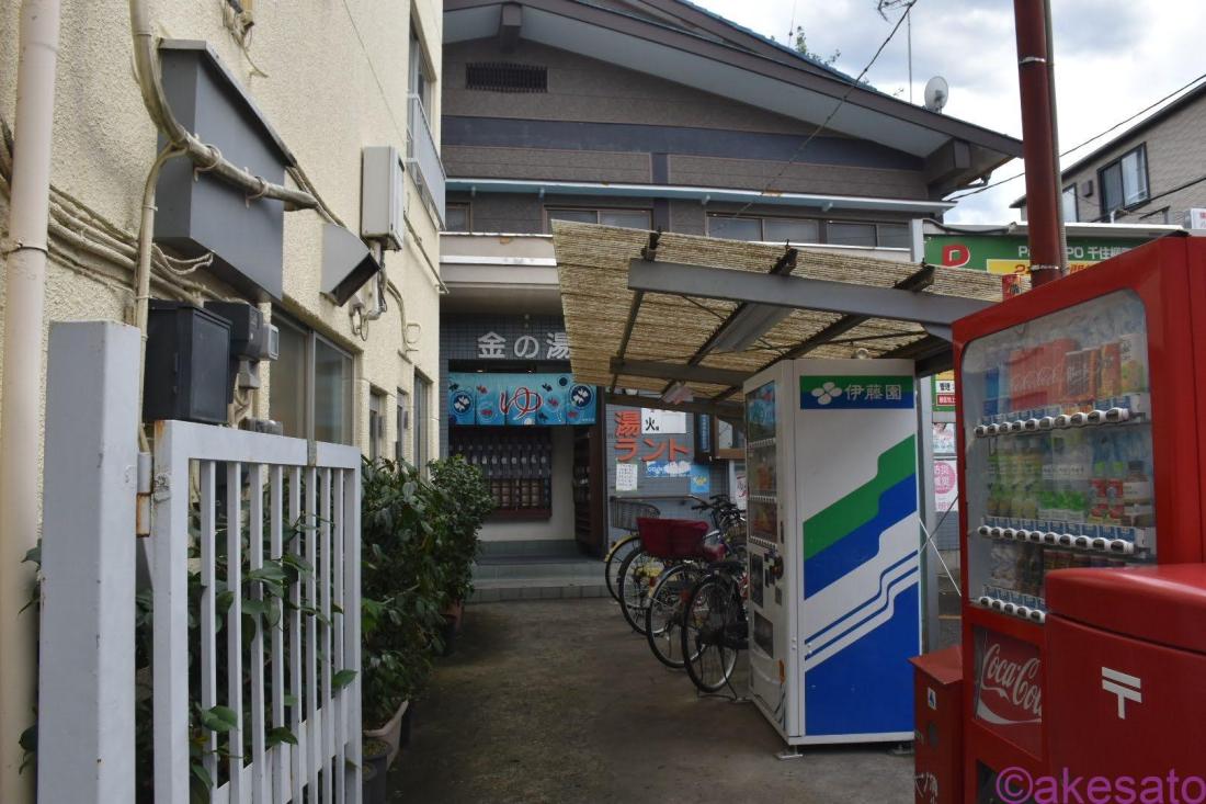 「金の湯」は、ニコニコ商店街の通りの建物の裏に隠れ家のようにひっそりと佇んでいる銭湯。ぼーっとしていたら通り過ぎてしまうだろう。銭湯の煙突を目印に建物の存在を知った。