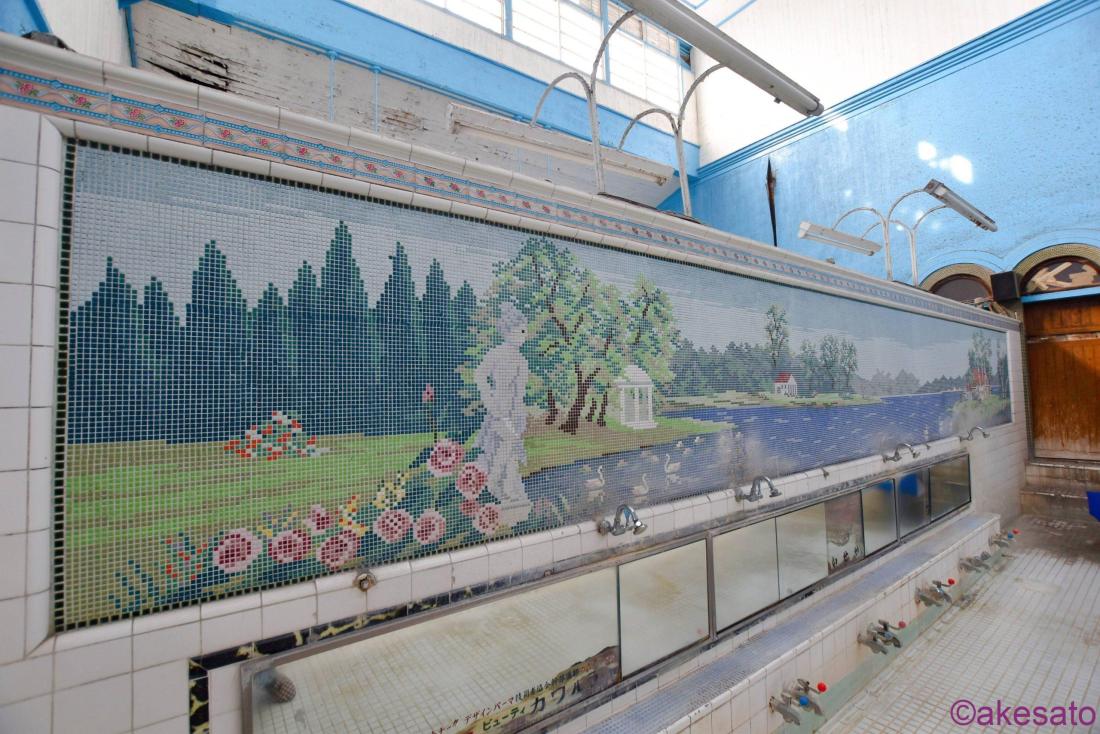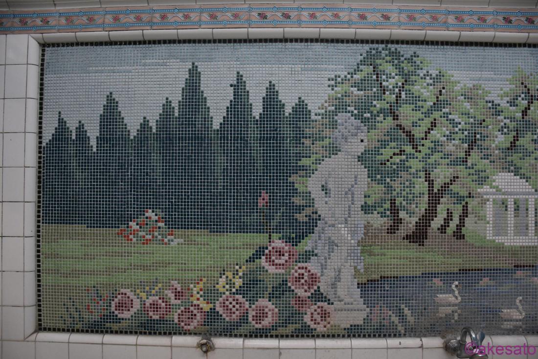 男湯の浴室。ヨーロッパを感じるモザイクタイルが凄い…上部には華やかなマジョリカタイルも。