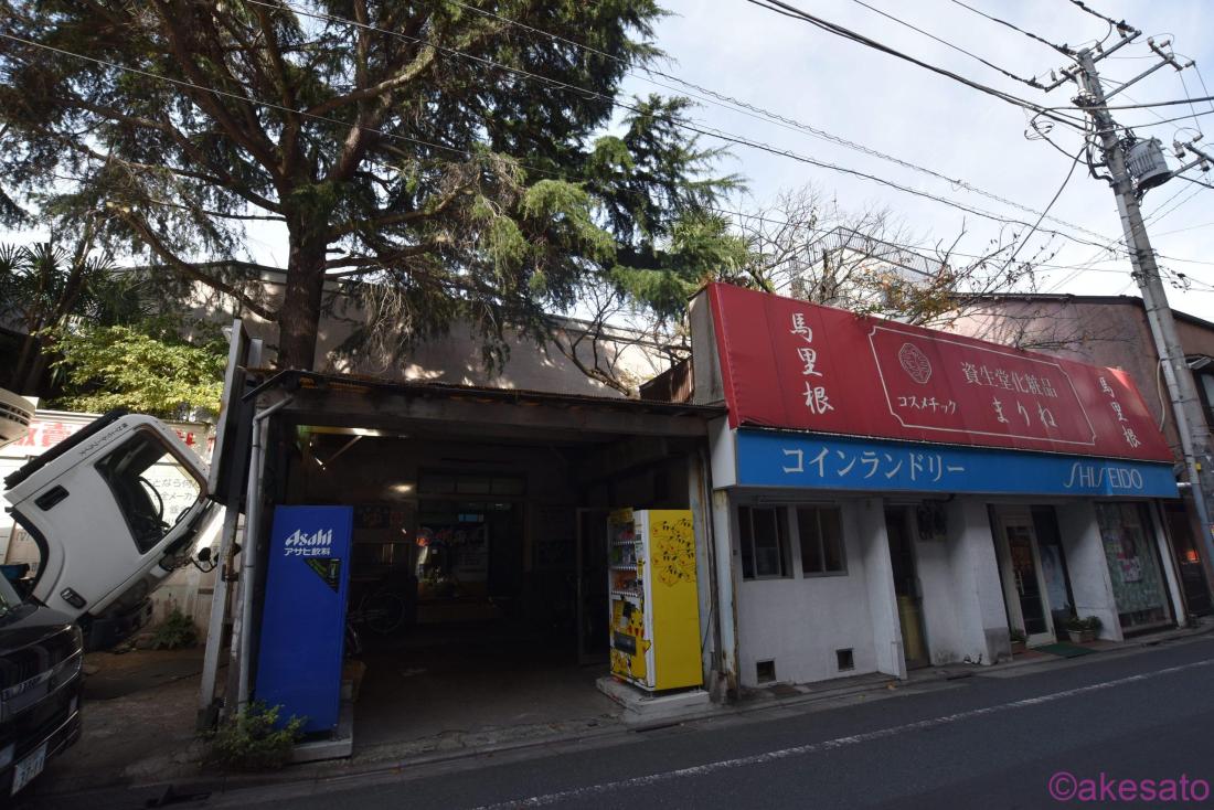JR小岩駅からフラワーロード商店街を徒歩5分ほど歩き、一本横の通りに入ったところにある銭湯「照の湯」。年月を経た木々とコインランドリー、その中央奥に銭湯の入り口があります。
