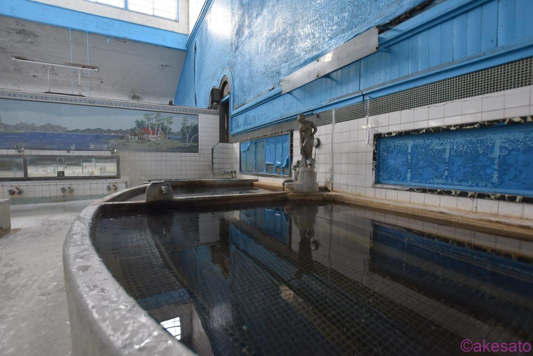 浴槽は半楕円形。壁にあるブルーの部分がかつての水槽。そして中央には女性像。