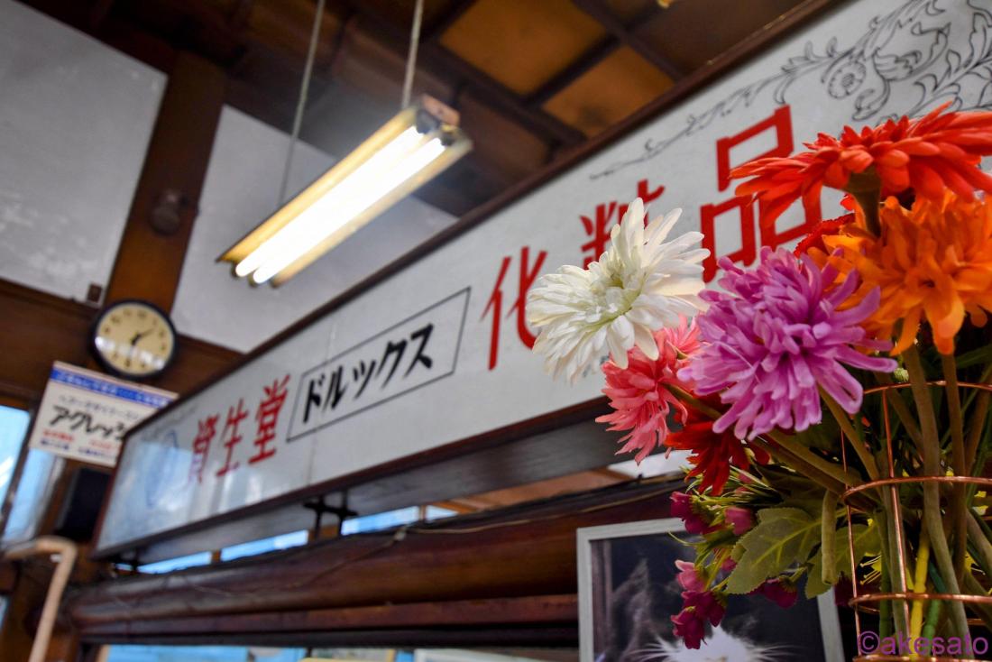 中央にある大きな鏡、桜の枝が一本丸ごと。資生堂化粧品のガラス看板も味わい深い。解体後に引き取りたいくらいだった…