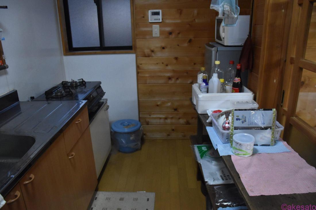 1階にあるキッチン。置いてある調味料や食器棚のお皿などは元の状態に戻せば自由に使用してOK。素泊まりなので持ち込んで自炊ができる。お米付き!