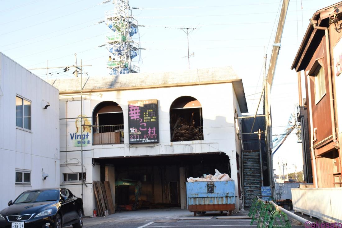薬局の店舗の奥に、解体中の2階建ての建物があった。看板の様子を見ると、居酒屋など色々な店舗が入っていたのかな~