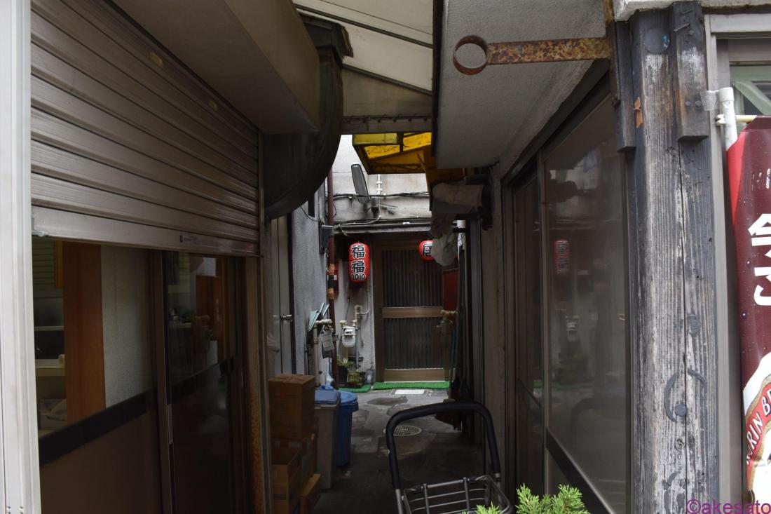 よーく見ると、カレー横丁とその隣の建物の間に人が一人通れる程度のわずかな路地がある。