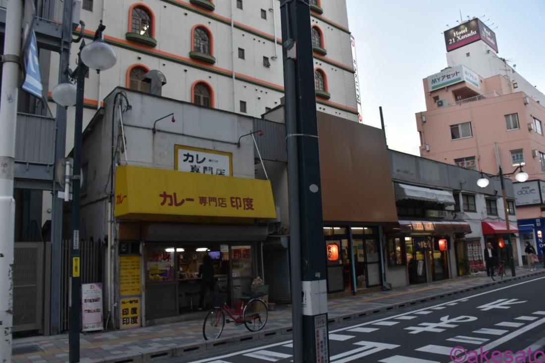「カレー専門店印度」の黄色い屋根が目に入る通りがある。