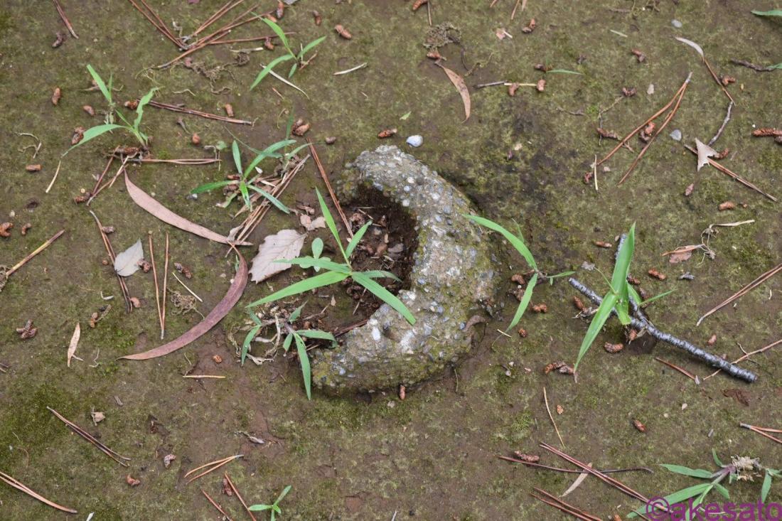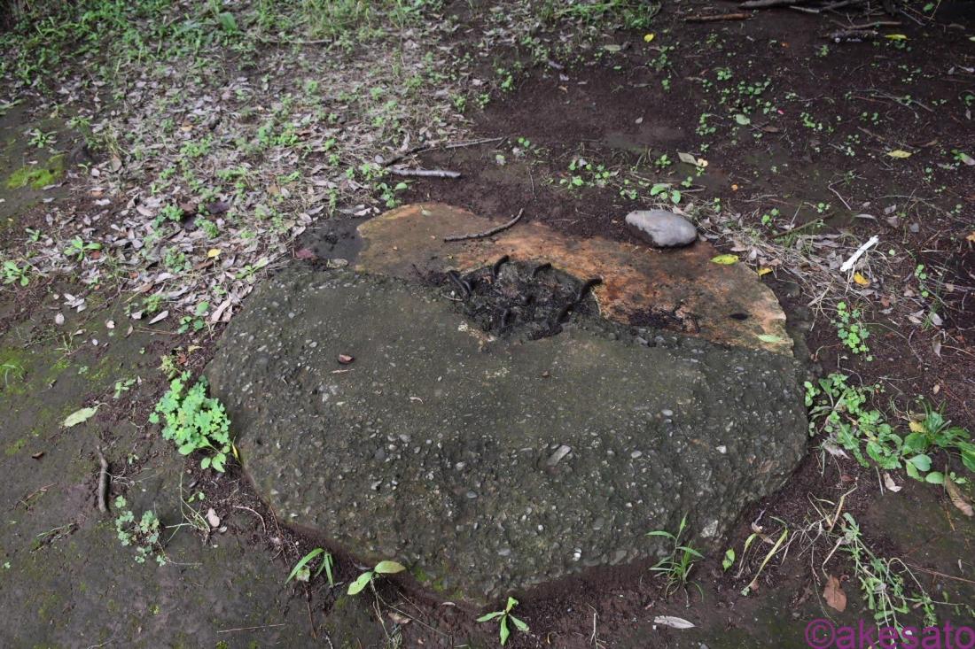 軍用地境界標石があった場所とは反対側へ。水が溜まっている石。これは何に使われていたのだろう?