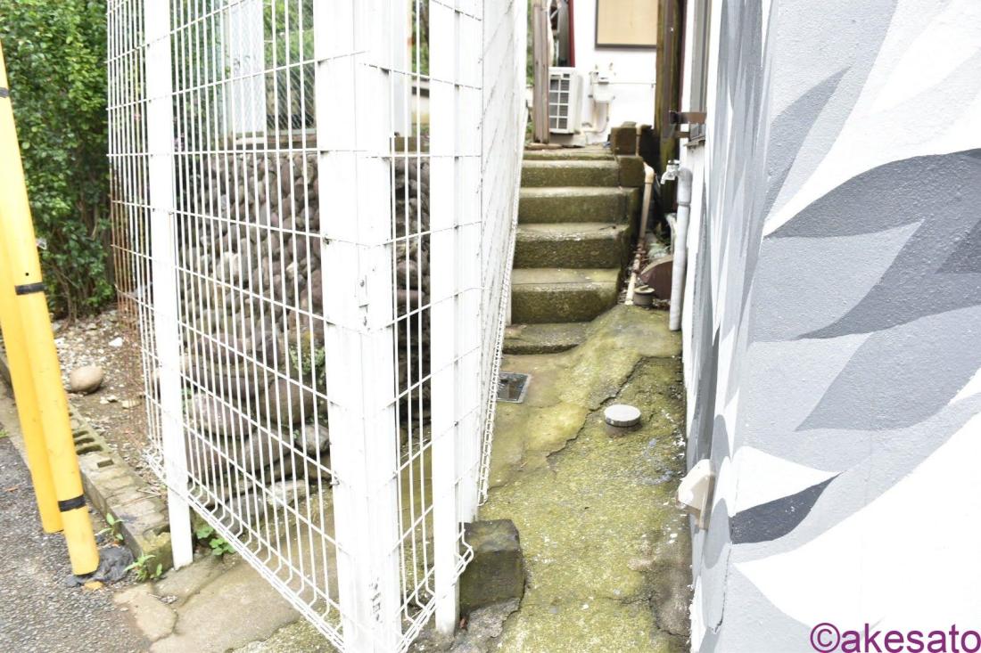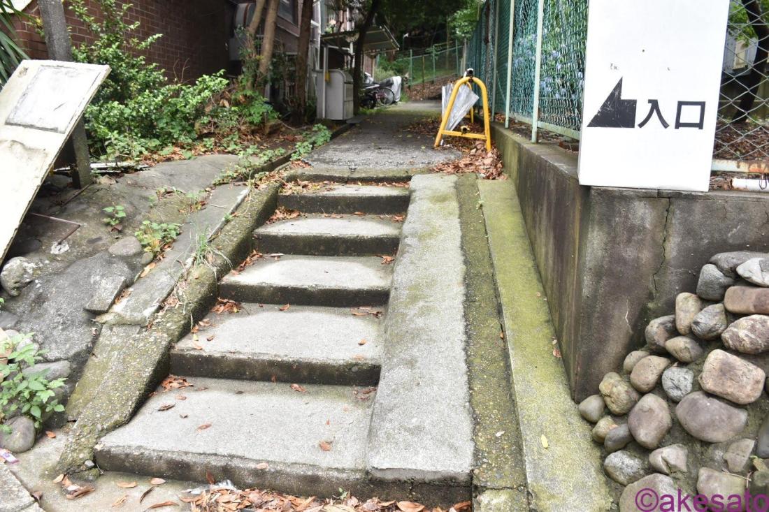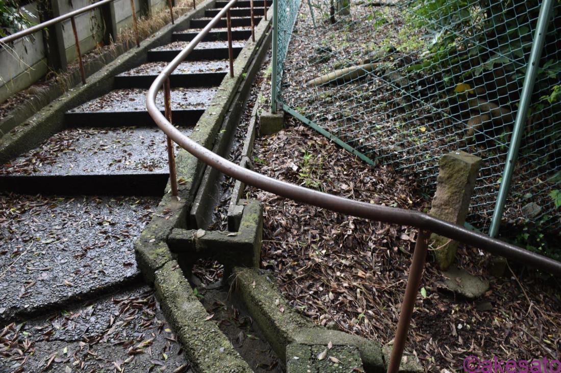 聖徳大学へと続く階段…この日が雨だったせいか、階段はじめじめしていた。おまけに階段が陥没しているところもあり、少々歩きにくい。この階段も相当古いものだろう。待ち構える戦争遺跡に相応しい道のり。