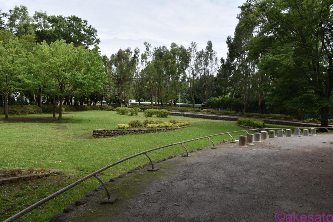 公園の中央部分には、一段低い場所が。原っぱが広がっているが、ここは池だったのだろうか?