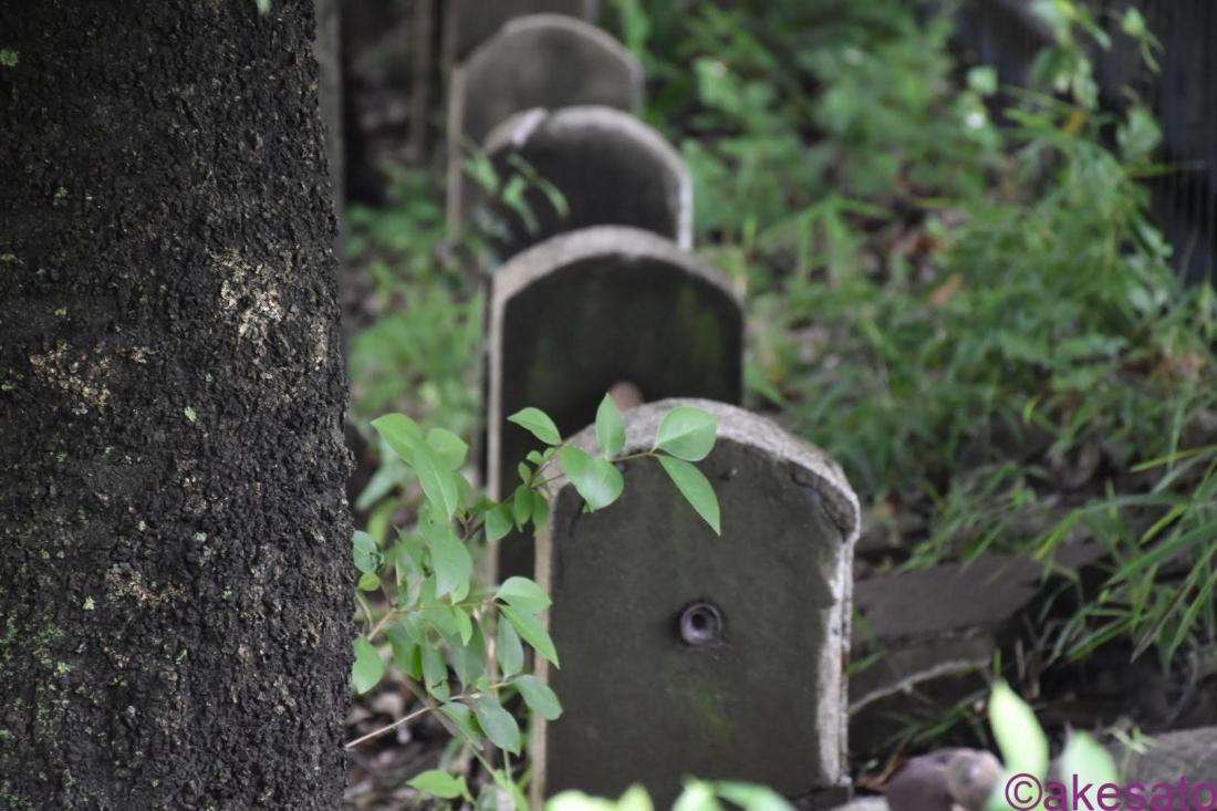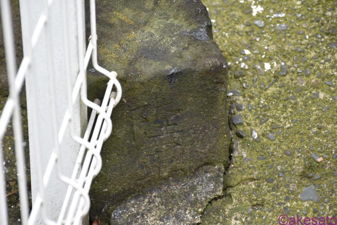 その建物を左手に、道を進んでいると、右手に白いフェンス…その下に埋もれるように小さな石碑を発見。