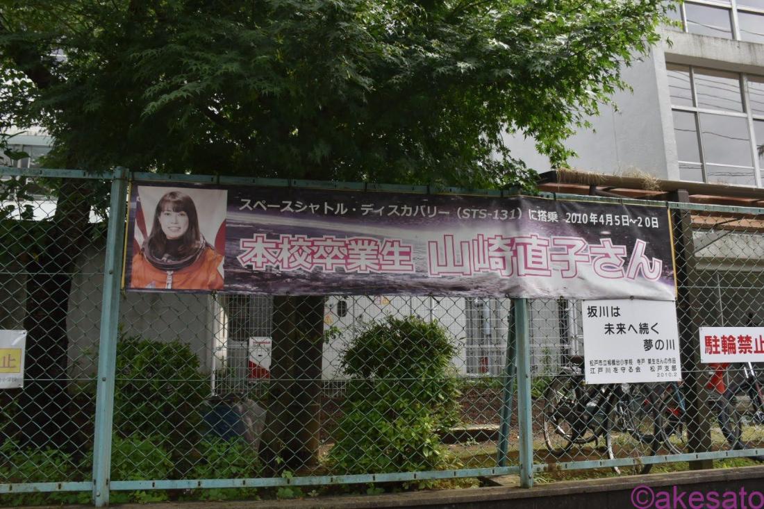 松戸中央公園に残る正門を出て、左の道を進む。五つ目の軍用地境界標石は、松戸市立第一中の裏手にあるようだ…距離が離れている。相模台小学校のフェンスには、山崎直子さんの垂れ幕が。松戸の出身だったのですね…