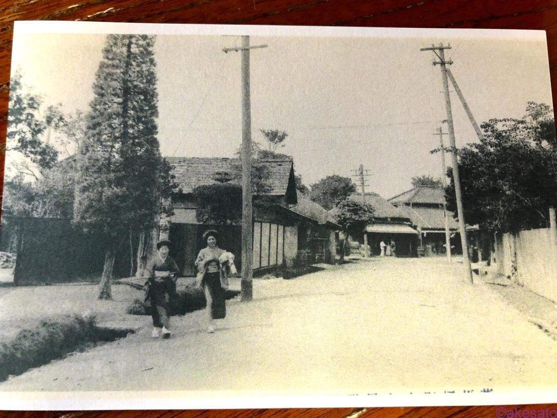 木造2階建ての旅館。下の絵葉書は旅館の周辺の道を写したものではないかと話していた。