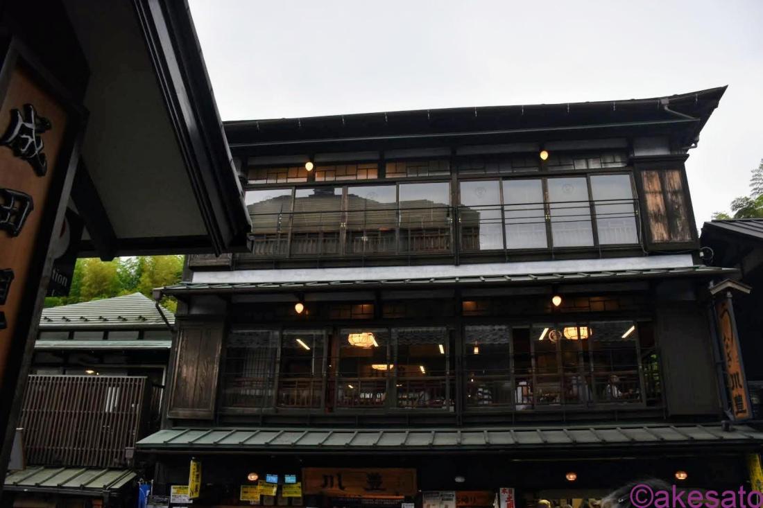 川豊本店の建物は、もともとは旅籠として使われていた明治44年(1911年)の木造3階建ての建物。令和元年には登録有形文化財にも指定され、古い建築が好きな方にとっては見逃せないつくりになっている。ちょっと離れて建物の全体像を見ると、2,3階の窓が渋い。