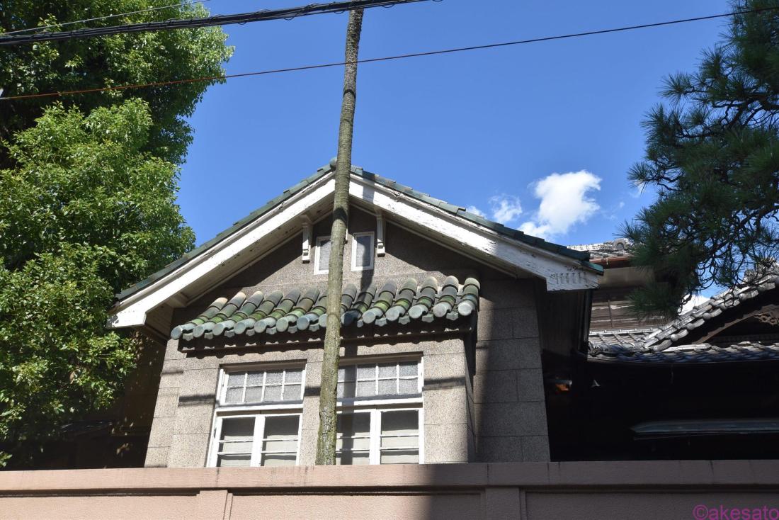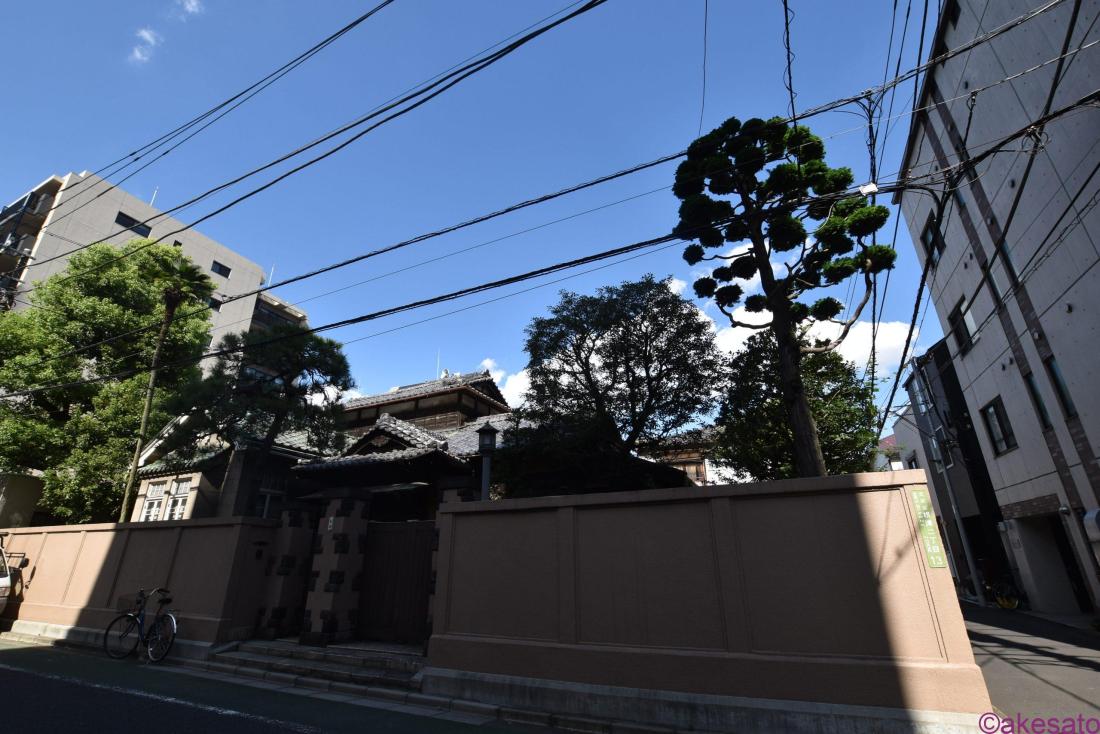 東京都文京区根津2丁目、国登録有形文化財のはん亭の建物の向かい側に佇む大きな屋敷。表に洋室が見える、典型的な和洋折衷住宅。