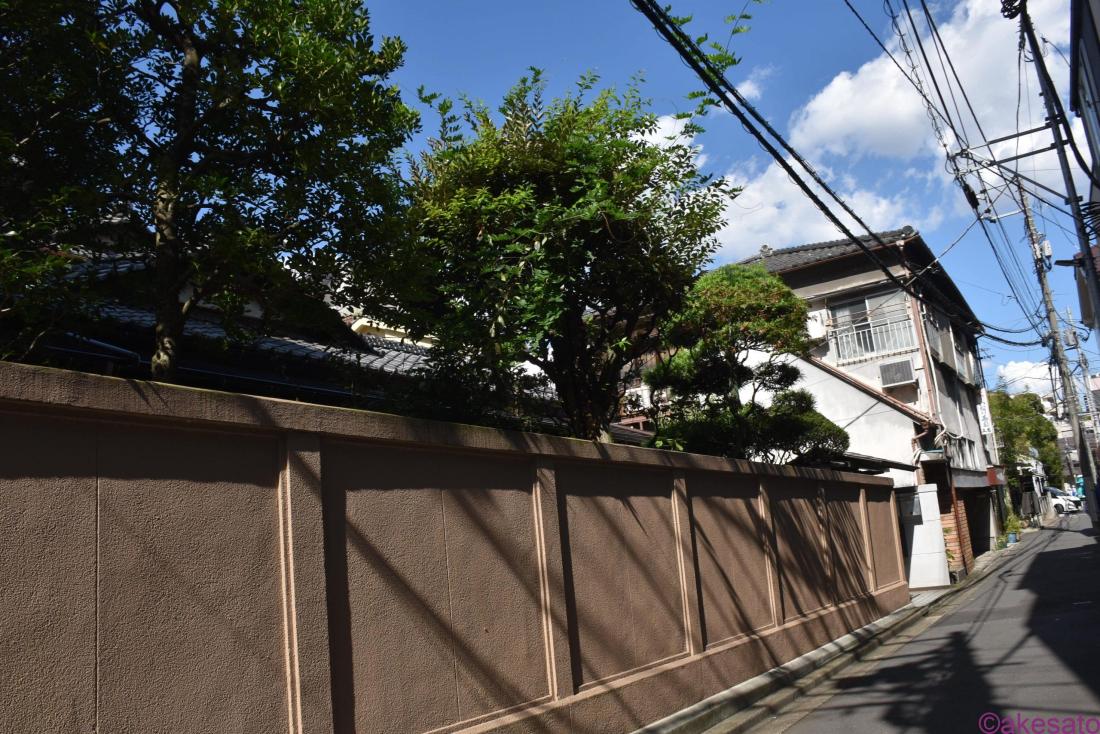 東京都文京区根津2丁目、国登録有形文化財のはん亭の建物の向かい側に佇む大きな屋敷。表に洋室が見える、典型的な和洋折衷住宅。