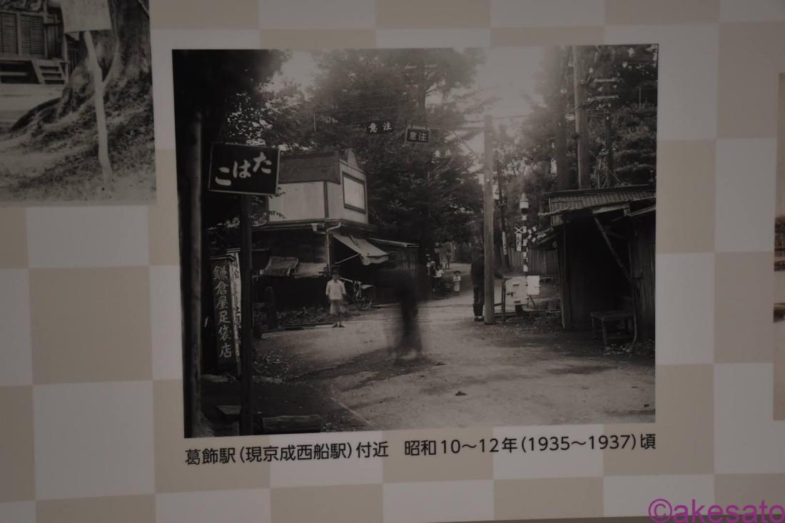 船橋市郷土資料館にて、昭和10~12年頃の写真が展示されていた。足袋店などがあり、自然豊かな駅前だったことがわかる。