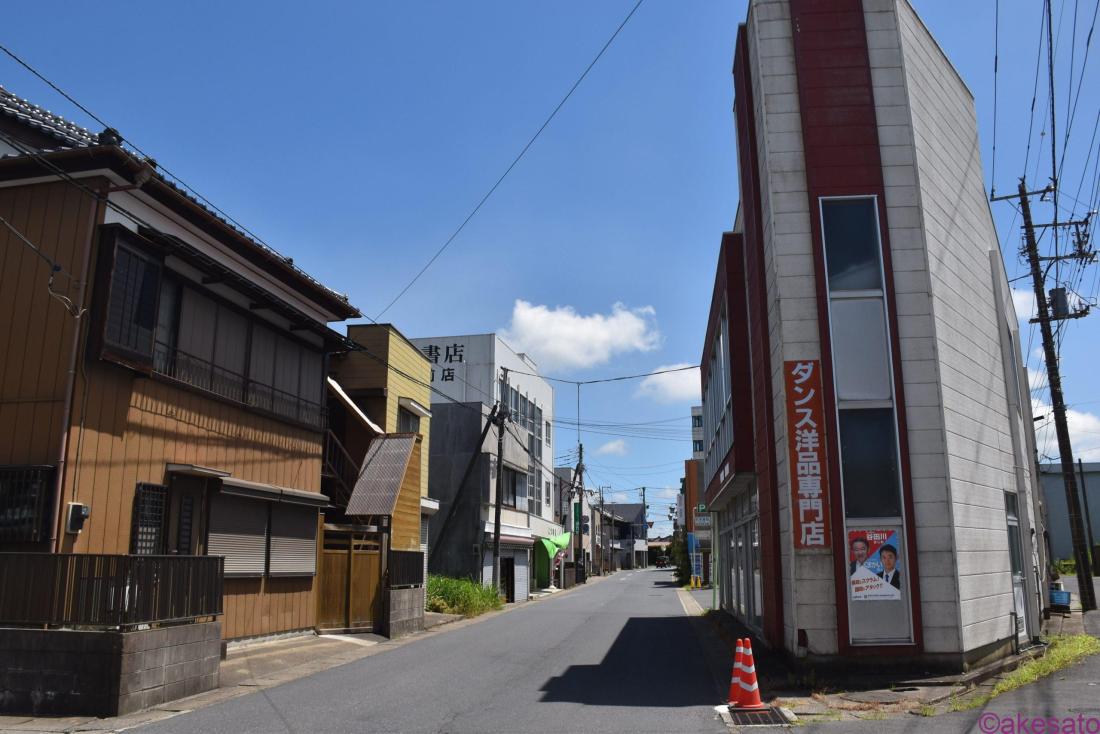 右手の建物はダンス洋品、婦人服のお店だったようだ。閉店している。