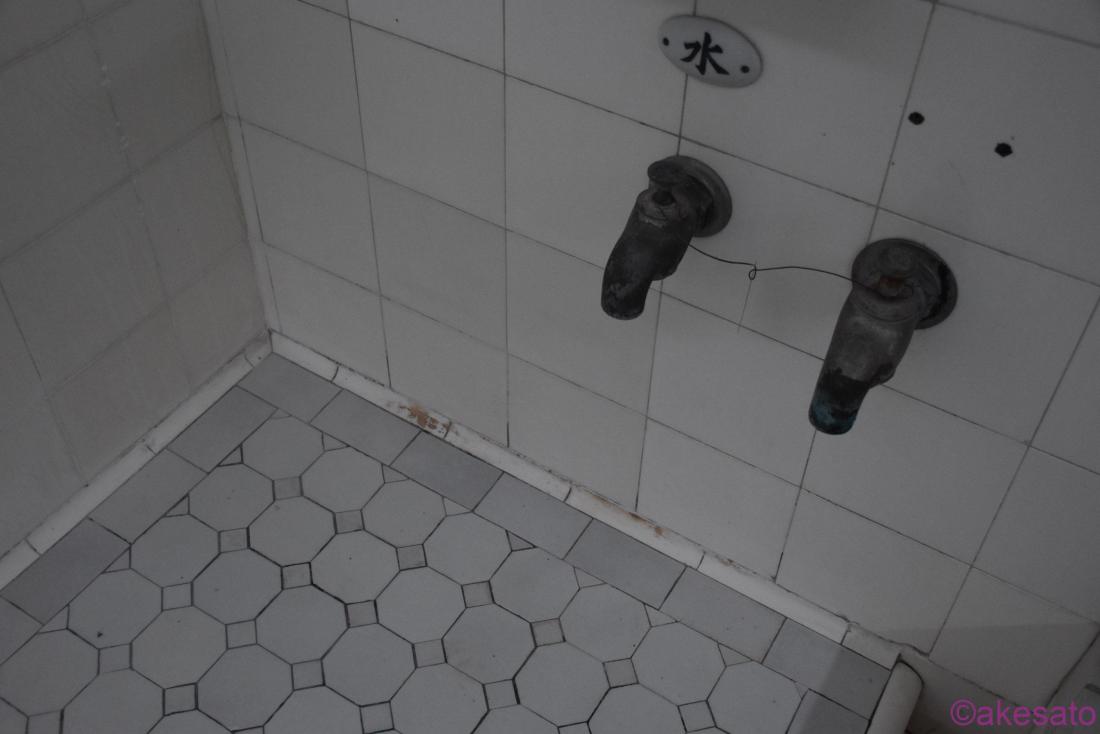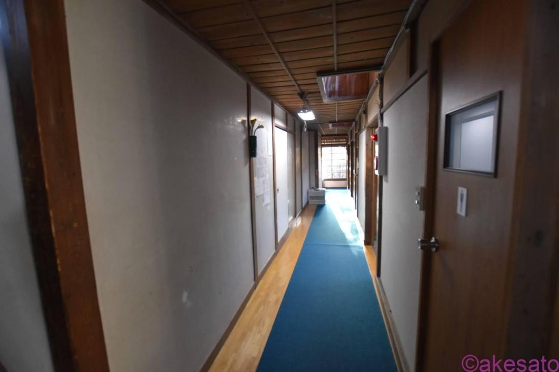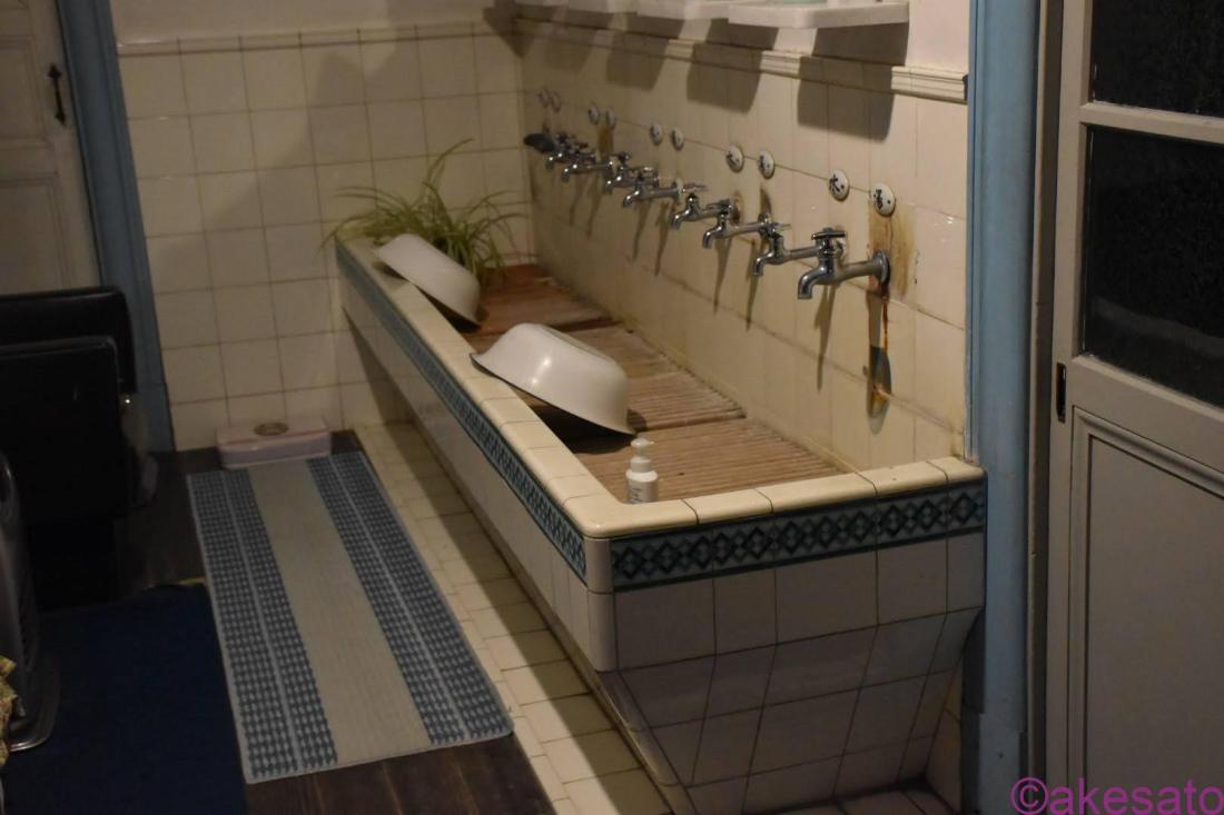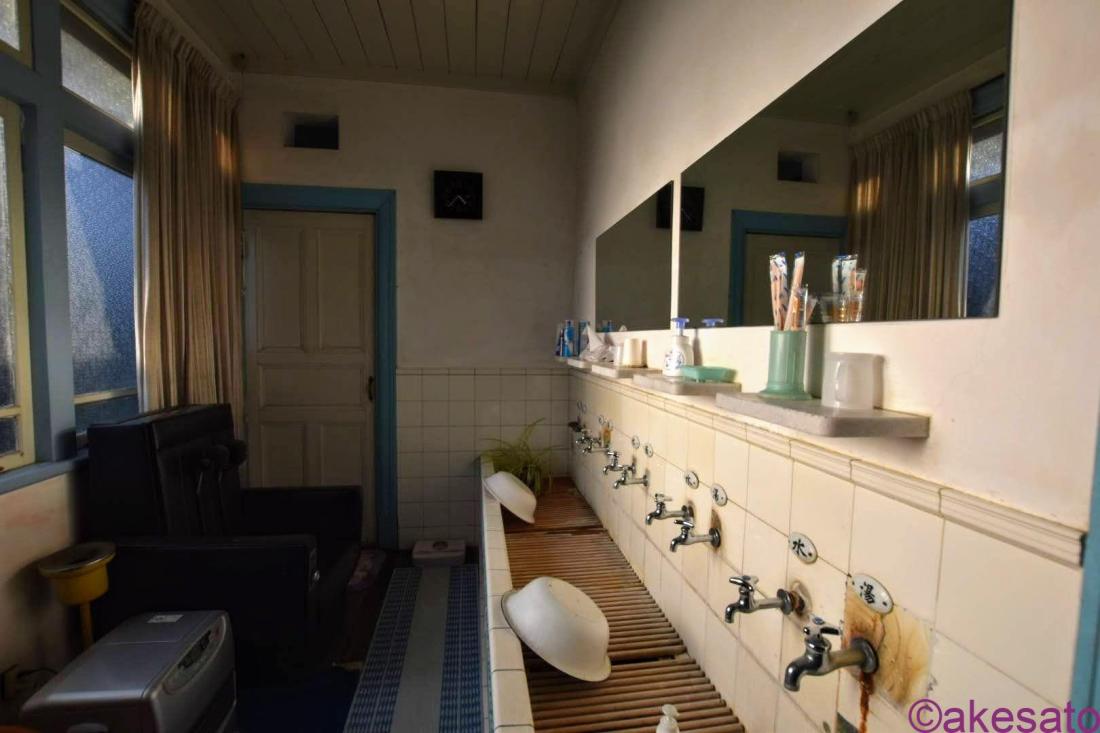 廊下が一段下がっているのがわかるだろうか?客室から一番近い洗面台が異様に低いのは、増築の証だろう。
