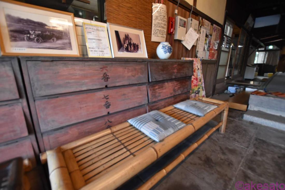 左にある箱は、昔の下駄箱。番号が振ってある。