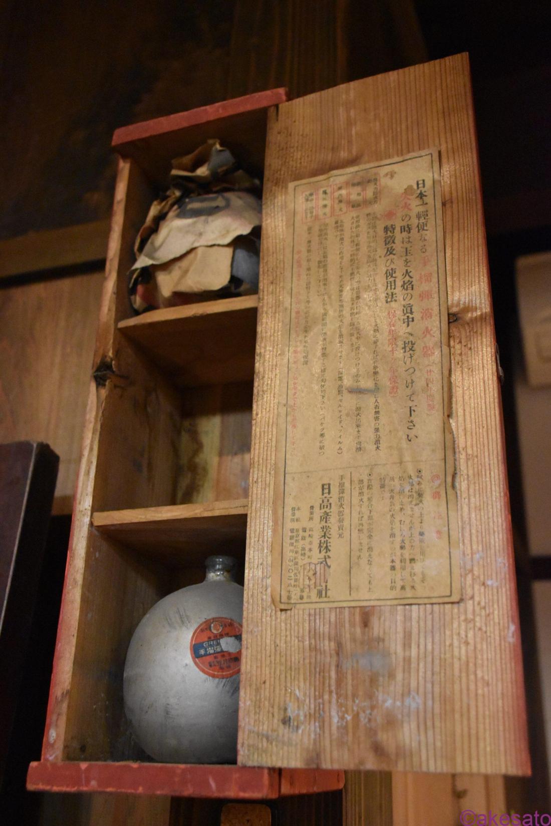 手榴弾消火器、他に山形県の老舗旅館で見たことがあるが千葉県内では他に見たことが無い。佐原の木の下旅館だけかな、現存しているのは…