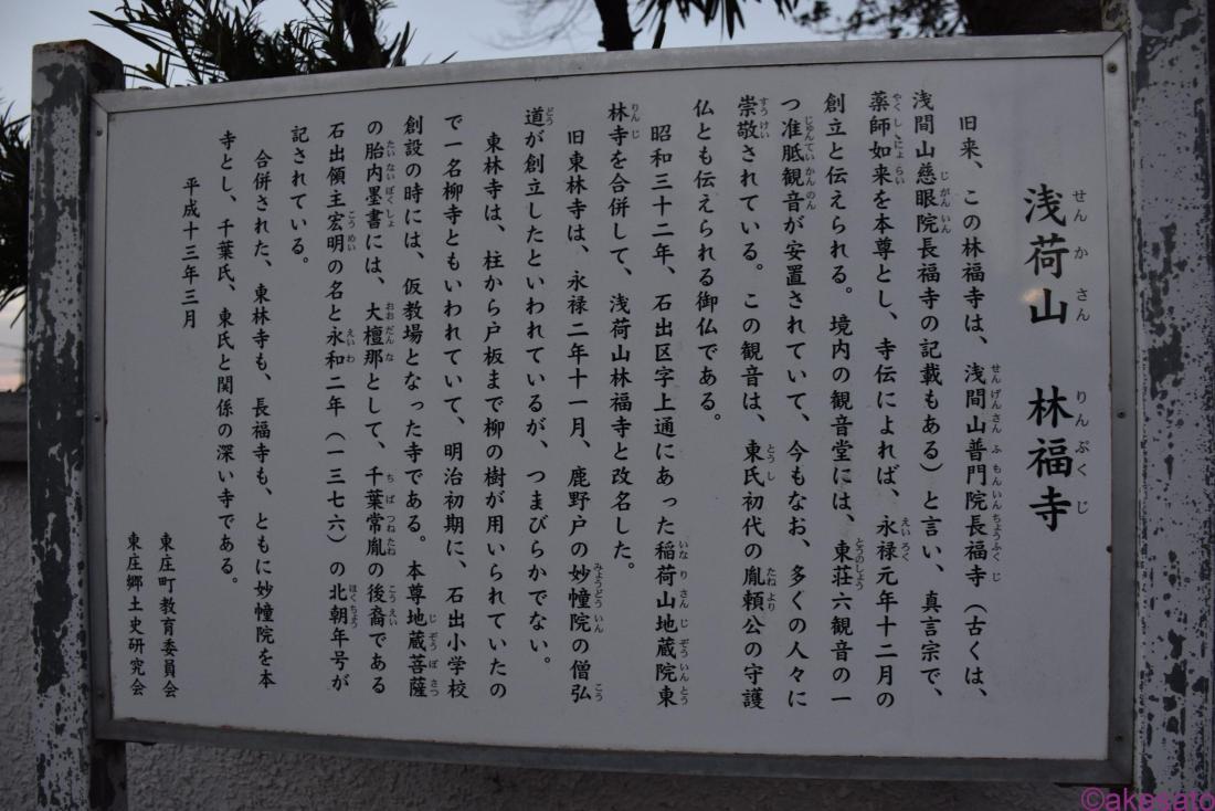 看板によると、旧来、浅間山普門長福寺と呼ばれていたそうだ。昭和32年に、石出区上通にあった稲荷山地蔵院東林寺を合併して、浅荷山林福寺と改名。