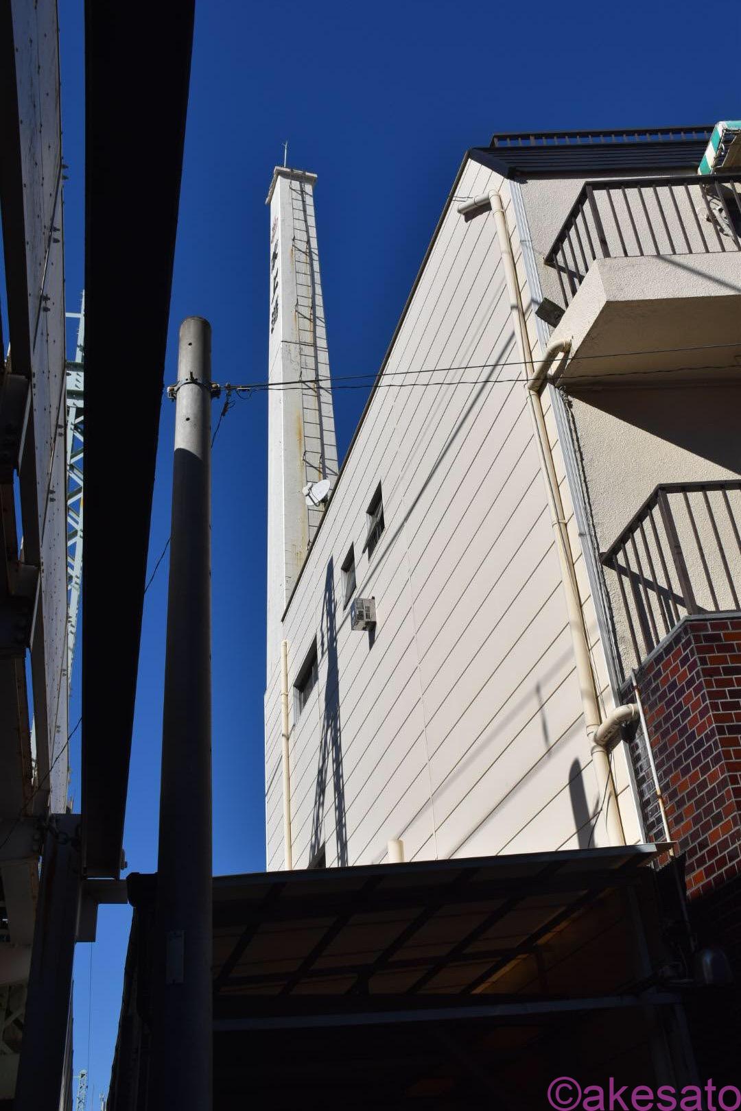 ビルの裏には、背の高い煙突がそびえ立つ。