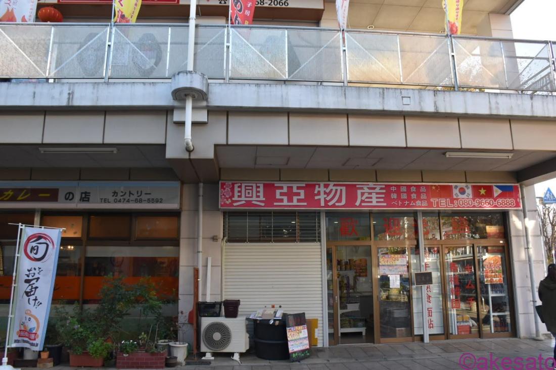 手前にあるのは中国や、韓国、ベトナム食品の物産店。団地の商店街ではよく見かける。