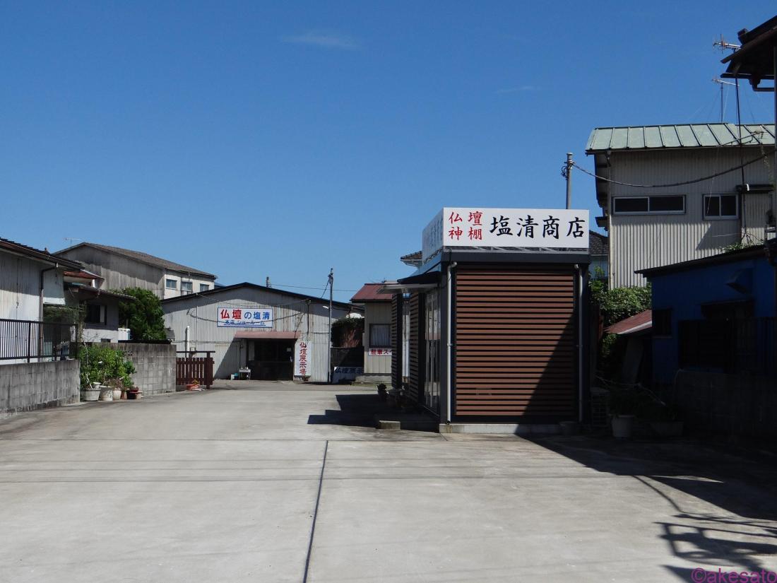 その隣にも近年解体されたが、カネモ呉服店の大きな店舗があった。向かいの仏具店「塩清商店」は店舗を変えて営業中。昔は家具も扱っていたみたい。