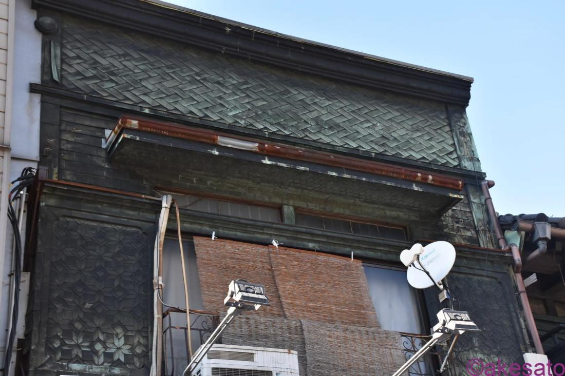 向かい側を見てみると、ビルに囲まれてちょこんと古い建物が残っていた。銅板の戸袋が素敵。