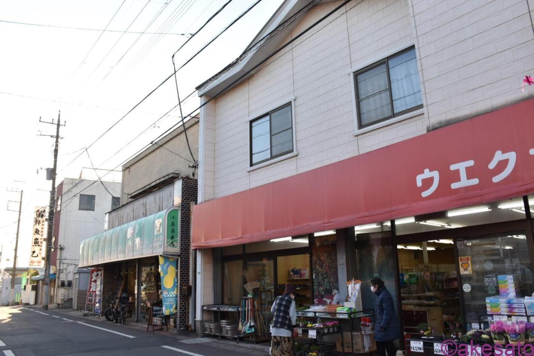 向かい側にあった薬局は閉店したようだ。その右隣は寿司・お弁当「かぶき」。その隣は変わらず青果部の建物である。