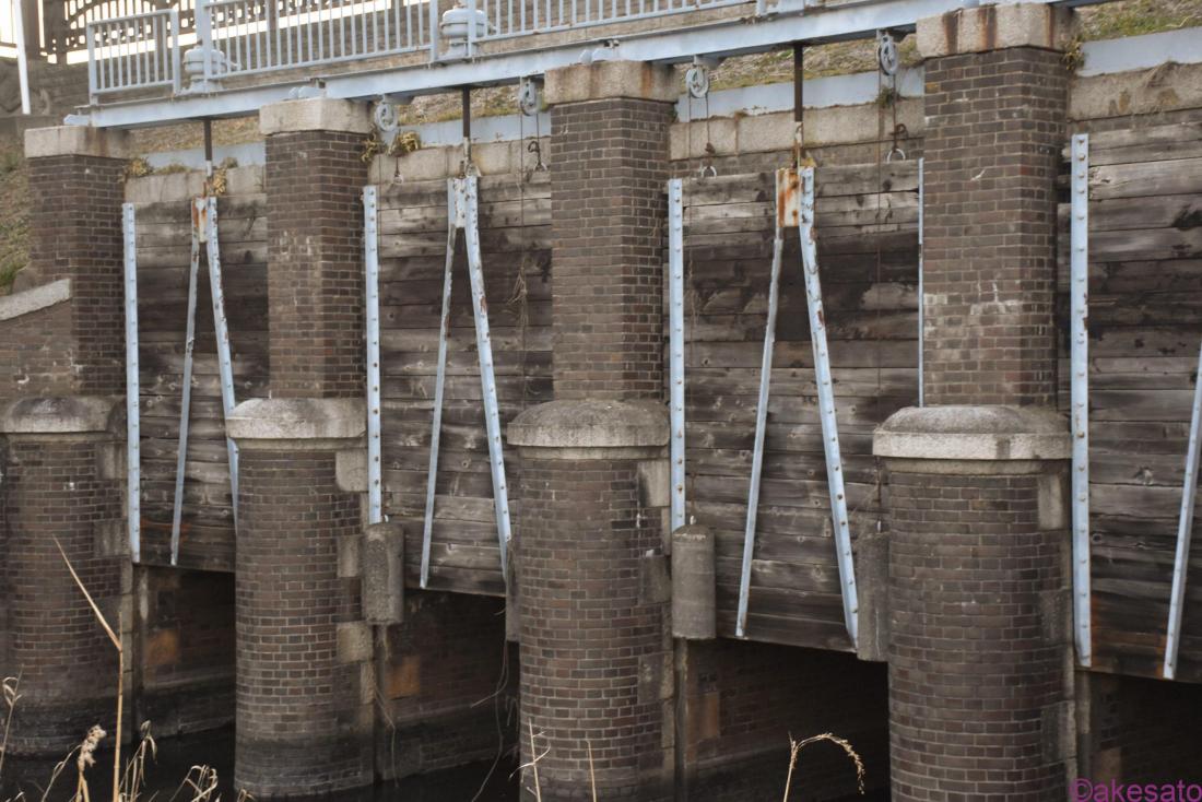 裏側もしっかりと煉瓦造りの柱が現存。現在は水閘としては使用されていない。