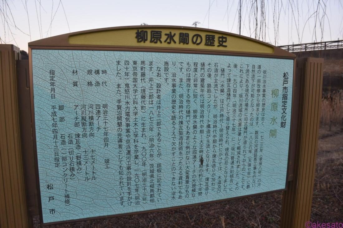 柳原水間(樋門)は、坂川治水のために 明治 37年( l 8 0 4 ) に造られました。鉄筋コンクリート造りが普及する前のレ ンガ造り4 アーチの樋門で、アーチ部分には大きさの違う石を用いた特徴的 な外観をもっています。明治時代のレ ンガ積み工法を伝える土木史上の貴重な建造物と言えます。(松戸市観光協会より)
