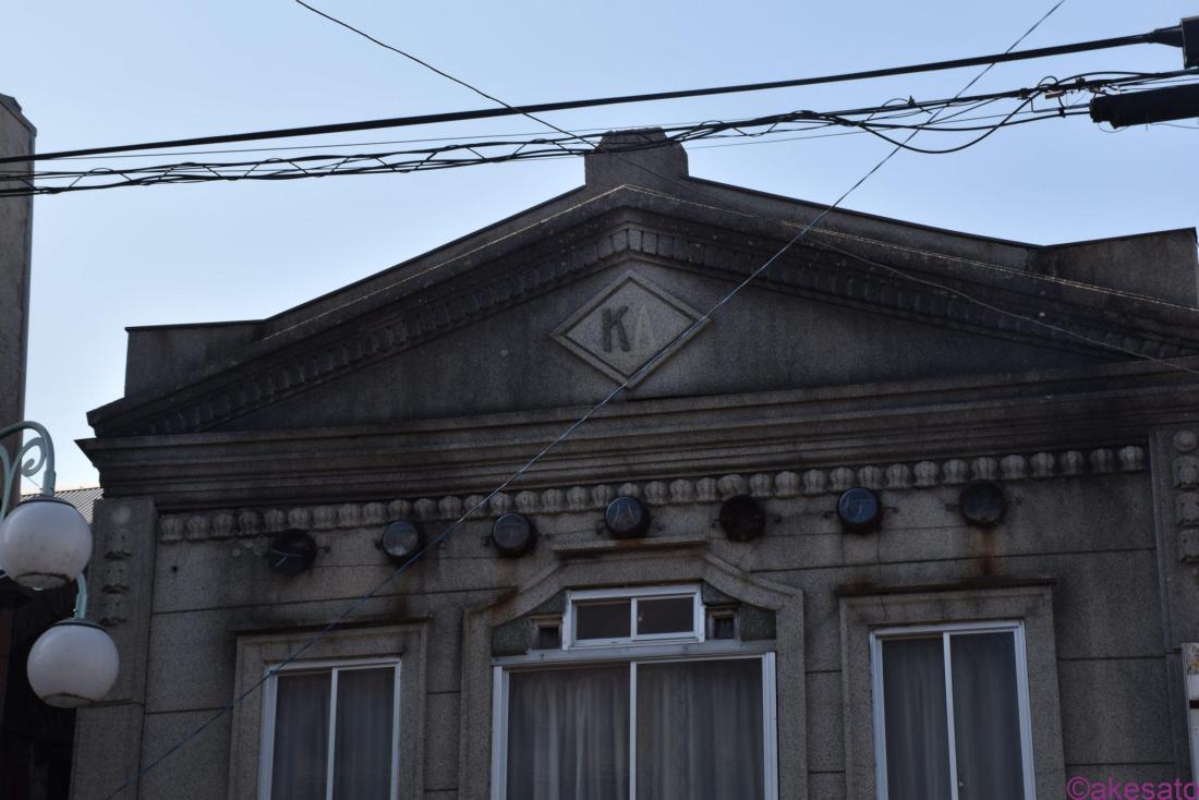 道路に面する側は、モルタルに目地を付け、石造風に仕上げ、隣家に接して道路から見えにくい部分は、波形の鉄板張りになっている。通りに面した正面のみにデザインを施したいわゆる「看板建築」の建物。2階部分は建築当初の姿をよくとどめており、正面上部の三角形の壁面(ペディメント)はギリシア神殿風の印象的な外観をつくる。ペディメント内の菱形の浮き彫りの中にはイニシャルも見られる。正面には、縦長の形の窓を3つ並べているが、中央の窓だけがやや大きく、変化をつけた形となっている。
