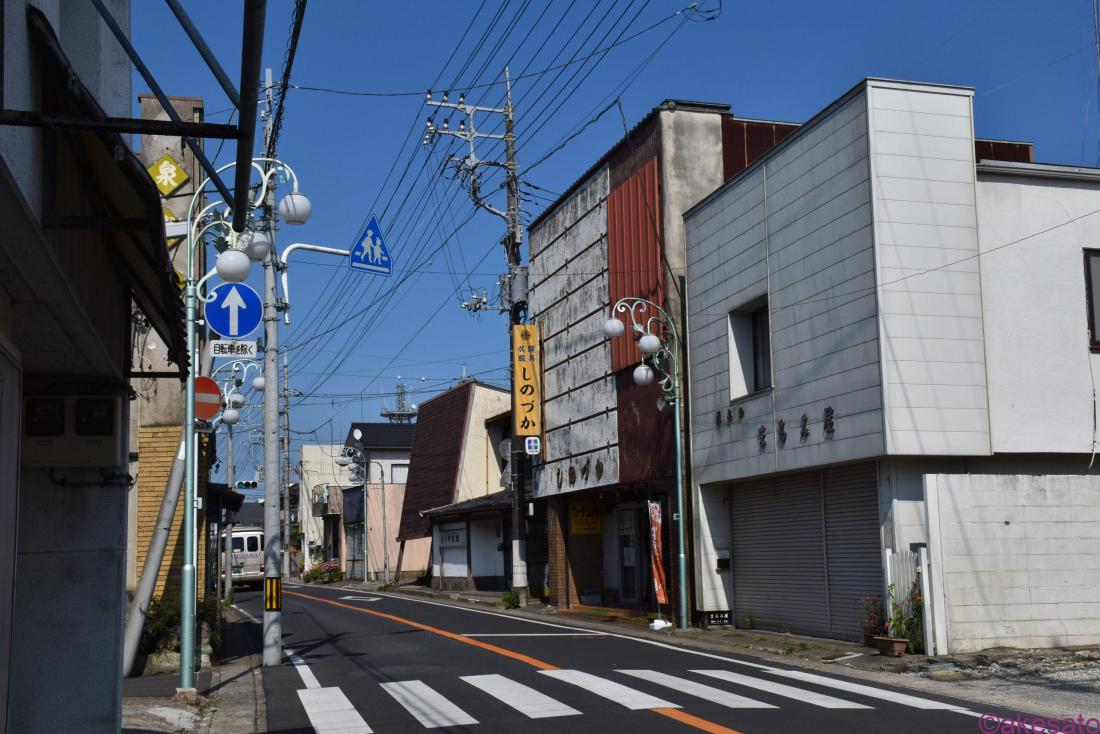 今回は丁字路から東へ、看板建築や旅館がある地域です。